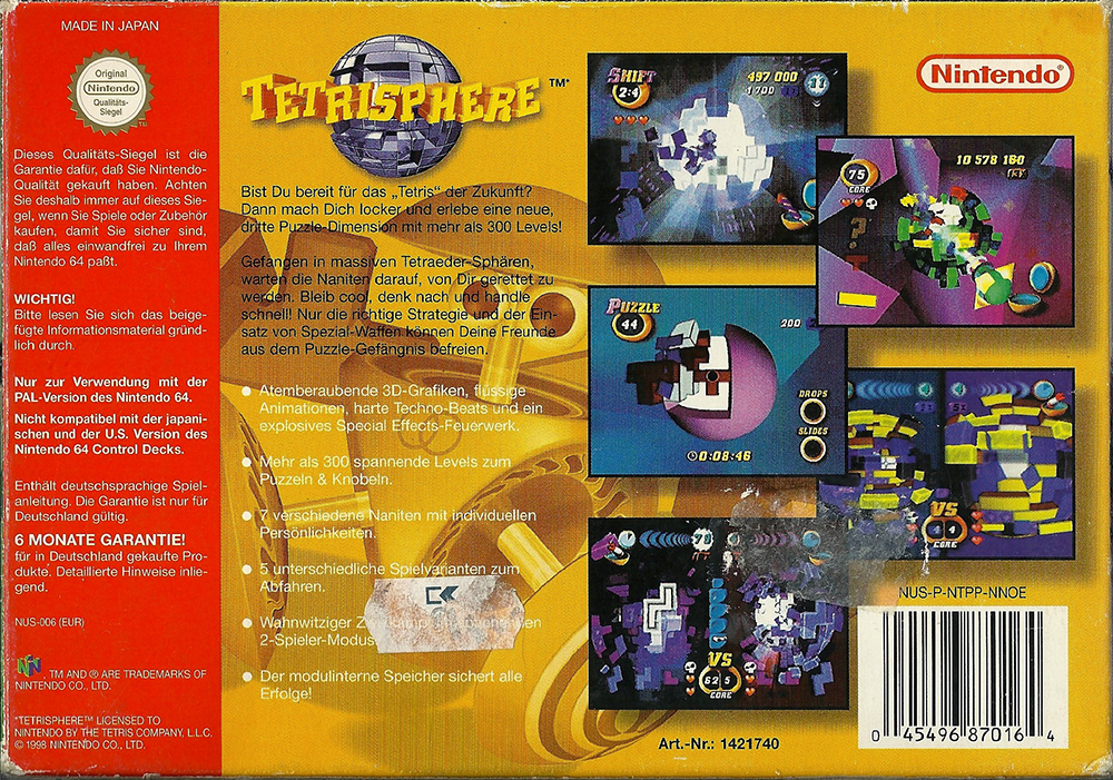 N64 – Tetrisphere back Published May 12, 2016 at 1000 × 701 in The Tetris Collection ← Previous Next → N64 – Tetrisphere back N64 – Tetrisphere back